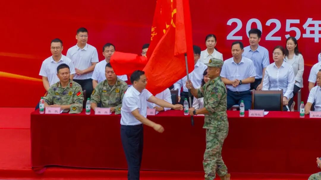 最后,程传红为军训团授旗,并宣布2025级新生军训开训。