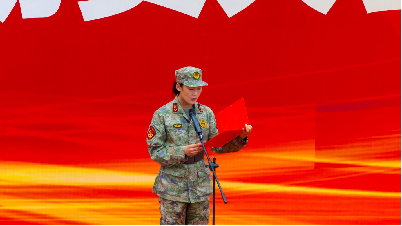 曾光荣参加九三阅兵式的教官代表张子扬在发言中承诺,全体教官将以身作则、科学施训,帮助同学们磨炼意志、塑造品格。她希望同学们严守纪律、刻苦训练,在军训中突破自我、收获成长,以更加饱满的热情和坚定的信念迎接大学生活。